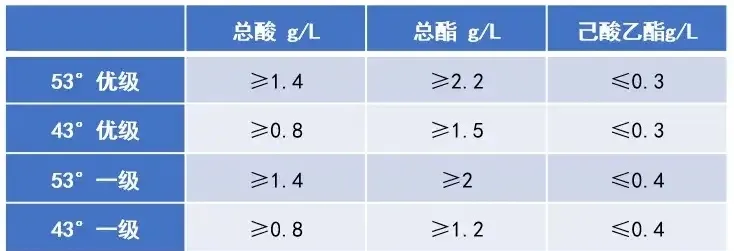 從上表可以看出,無論是優級還是一級,53度的酸、酯含量都比43度高。