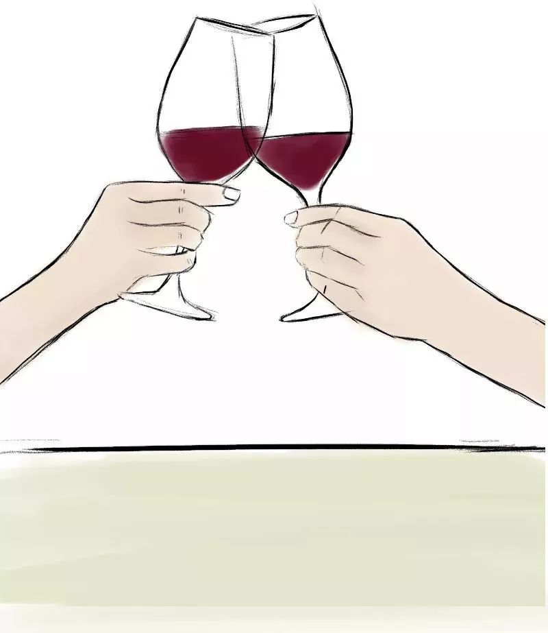 西方人喝紅酒的時候一般是各自喝各自的,根據自己的用餐節奏,不太經常干杯、碰杯。有時會隔著桌子舉杯示意一下,如果需要碰杯,會用這樣的交叉式碰杯: