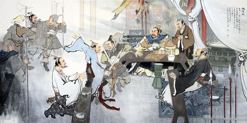 公元前206年劉邦先入關滅秦進駐咸陽,并派兵守函谷關,以拒項羽西進。項羽率大軍至,破函谷關,進駐鴻門,準備襲擊劉邦。劉邦因勢力懸殊,采納張良建議,結(jié)交項羽叔父項伯,請予調(diào)解,以作緩兵計,并親至鴻門會見項羽。在宴會上,項羽謀士范增令項莊舞劍,欲刺殺劉邦。項伯急拔劍起舞,以身掩護,后劉邦部將樊噲帶劍執(zhí)盾闖入護衛(wèi),劉邦得以脫險。這次宴會史稱鴻門宴。