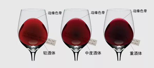 如上圖可以看出:一般陳釀的紅葡萄酒顏色會加深,通常邊緣色調較寬,其單寧跟色素會發生聚合反應,色彩逐漸衰退,逐漸向磚紅色和棕色發展,不會帶有紫色的邊緣色調。陳釀數十年的葡萄酒通常會有琥珀色或茶色。酒腿是指搖晃酒杯之后,在杯壁上形成的一層酒液膜和緩緩流下的一串串液體。這些像眼淚一樣掛在杯壁上的液體也被稱為“酒淚”或是“掛杯”。它的形成與酒精接觸空氣揮發有關,也與葡萄酒的殘糖含量有一定關系。一般來說,如果一杯葡萄酒越粘稠,酒腿越厚,流動的速度越慢,則大致可以推斷該酒的酒精度高或者甜度高。邊緣密度高,比較高的可能性是酒體扎實、釀得不錯的酒;如果這個邊緣看上去顏色稀疏,有可能那一年的葡萄在成熟期時雨水比較多,要不然,就是破皮率比較高。